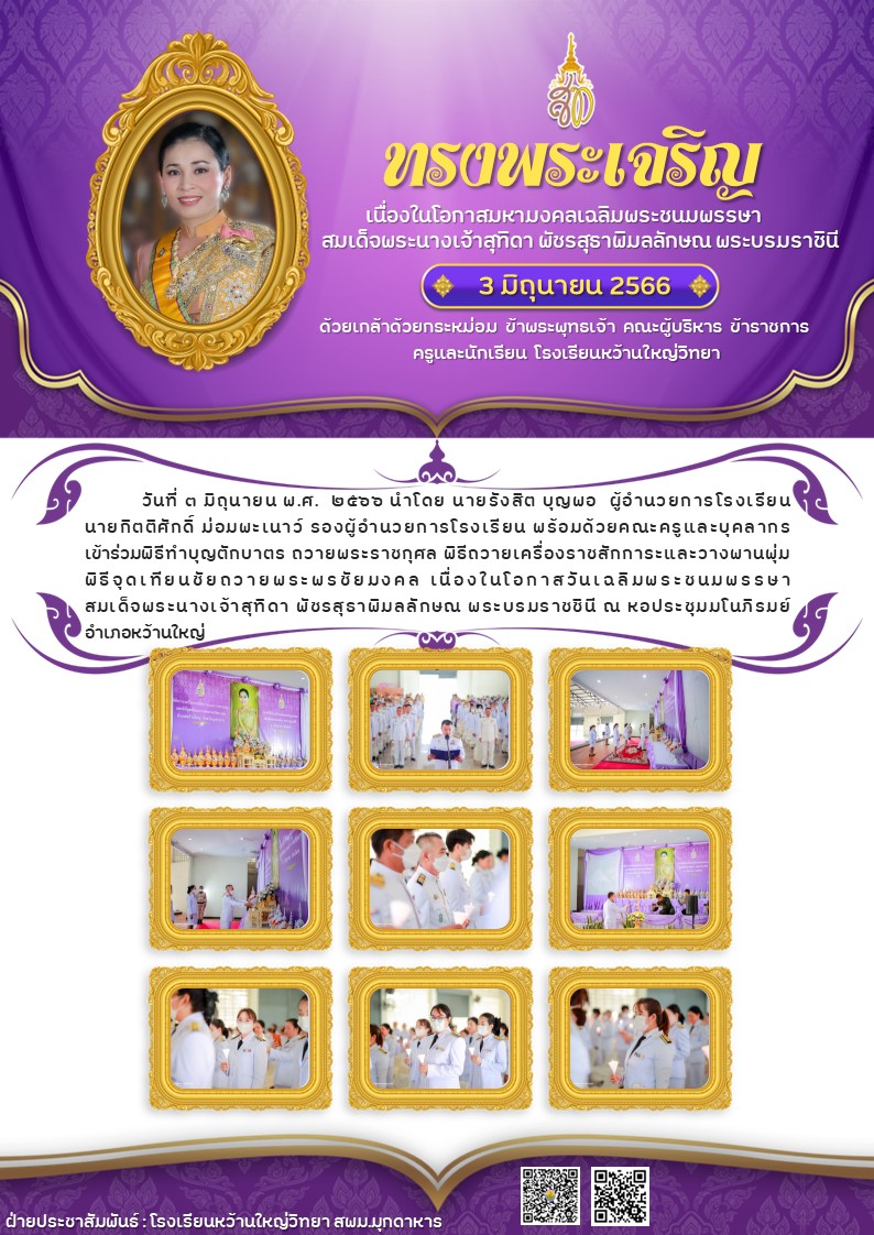 ร่วมพิธีทำบุญตักบาตร ถวายพระราชกุศล พิธีถวายเครื่องราชสักการะและวางพานพุ่ม พิธีจุดเทียนชัยถวายพระพรชัยมงคล เนื่องในโอกาสวันเฉลิมพระชนมพรรษา สมเด็จพระนางเจ้าสุทิดา พัชรสุธาพิมลลักษณ พระบรมราชชินี ณ หอประชุมมโนภิรมย์ อำเภอหว้านใหญ่