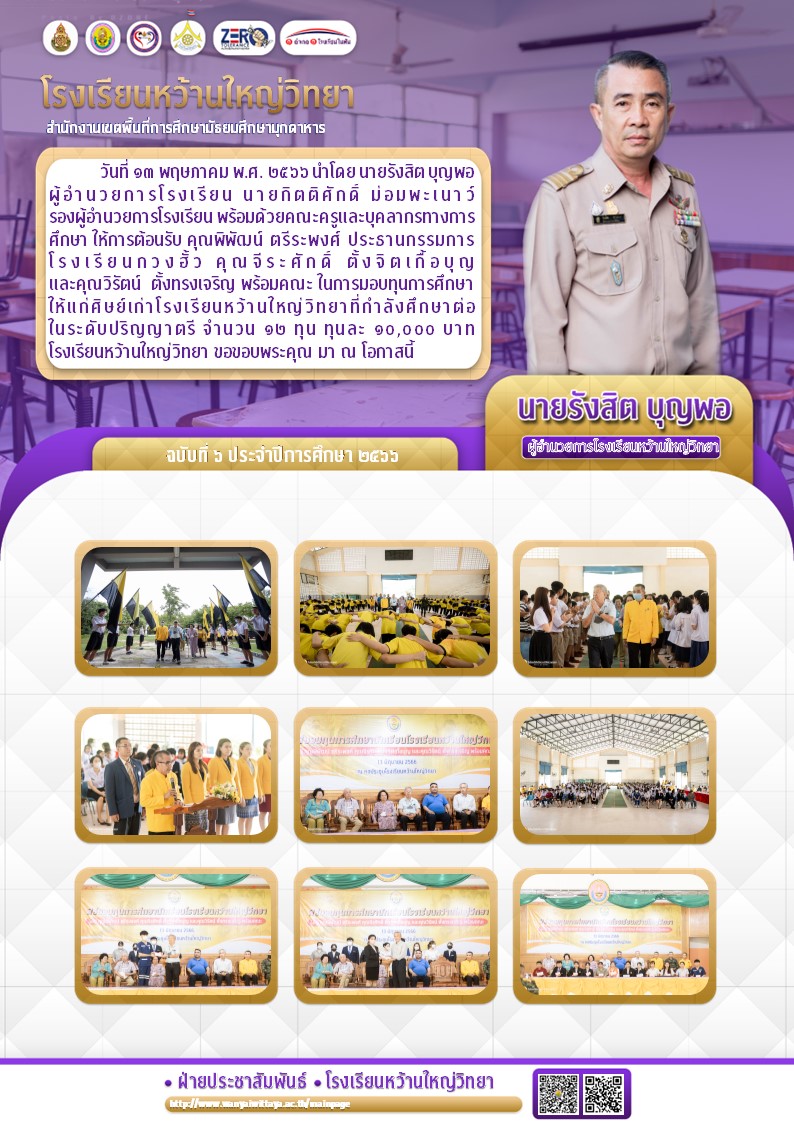 คุณพิพัฒน์ ตรีระพงศ์ ประธานกรรมการโรงเรียนกวงฮั้ว คุณจีระศักดิ์ ตั้งจิตเกื้อบุญและคุณวิรัตน์ ตั้งทรงเจริญ พร้อมคณะ ในการมอบทุนการศึกษาให้แก่ศิษย์เก่าโรงเรียนหว้านใหญ่วิทยาที่กำลังศึกษาต่อ ในระดับปริญญาตรี จำนวน ๑๒ ทุน ทุนละ ๑๐,๐๐๐ บา